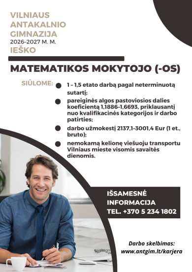 Vilniaus Antakalnio gimnazija ieško matematikos mokytojo (-os), atsakingai dirbančio (-ios) ir siekiančio (-ios) mokinių pažangos.
