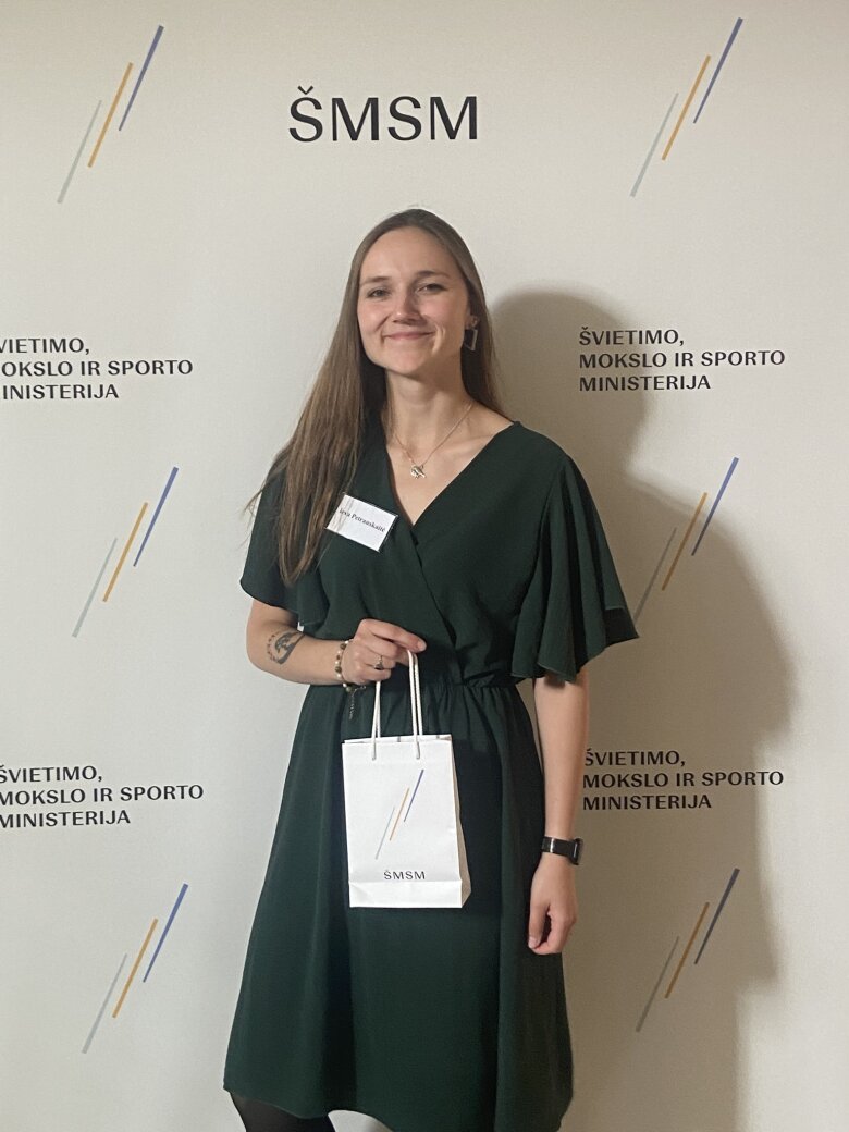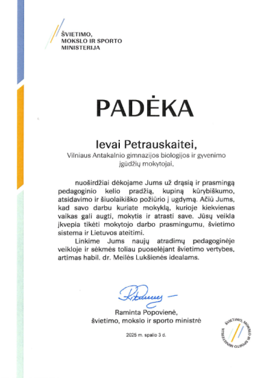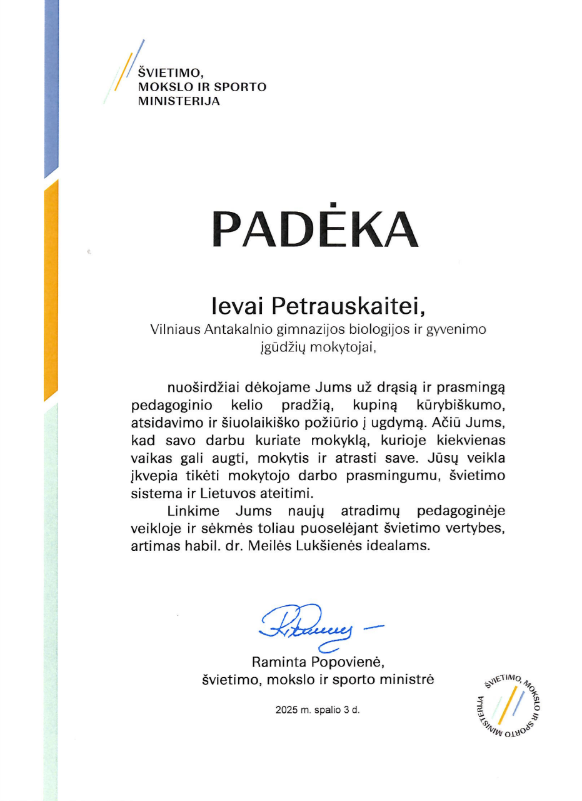 Didžiuojamės, kad mūsų gimnazijos biologijos ir gyvenimo įgūdžių mokytoja Ieva Petrauskaitė atitinka šios premijos gavimo kriterijus ir buvo pakviesta dalyvauti Švietimo mokslo ir sporto ministerijoje rugsėjo 26 d. renginyje-diskusijoje, skirtoje premijai gauti.