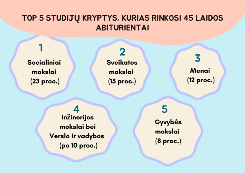 2025 metais Vilniaus Antakalnio gimnazijos abiturientai, įgiję vidurinį išsilavinimą, daugiausia pasirinko studijas socialinių ir sveikatos mokslų krypčių grupėse. Taip pat išryškėjo menų bei inžinerijos sričių populiarumas, atspindintis 45 laidos plačius interesus ir įvairiapusius gebėjimus – nuo kūrybinių industrijų iki technologijų bei medicinos.