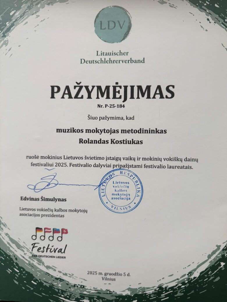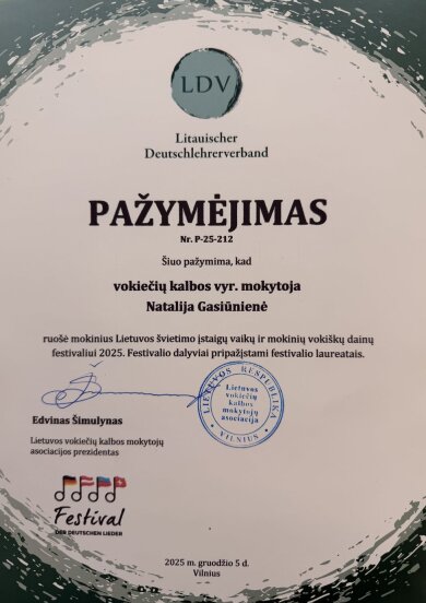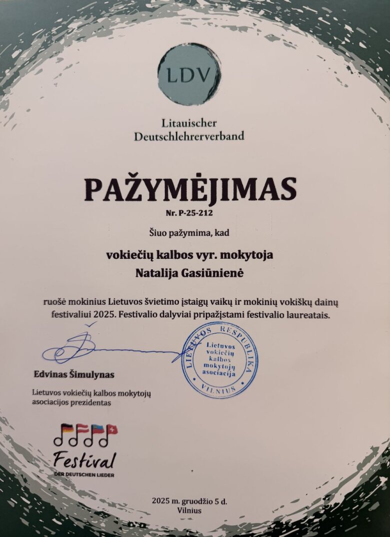 Š. m. gruodžio mėnesį Vilniaus Mykolo Biržiškos gimnazijoje įvyko vokiškų dainų festivalis, sujungęs vokiečių kalbą, muziką, geras emocijas ir bendrystę. Džiaugiamės, kad tarp 23 dalyvavusių kolektyvų festivalio laureatais tapo ir mūsų gimnazijos mokinių grupė!