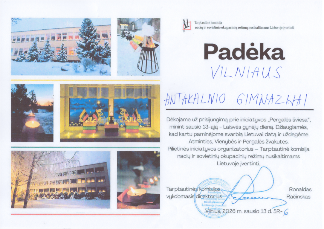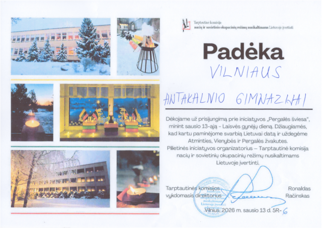 Padėka gimnazijai už dalyvavimą iniciatyvoje „Pergalės šviesa“