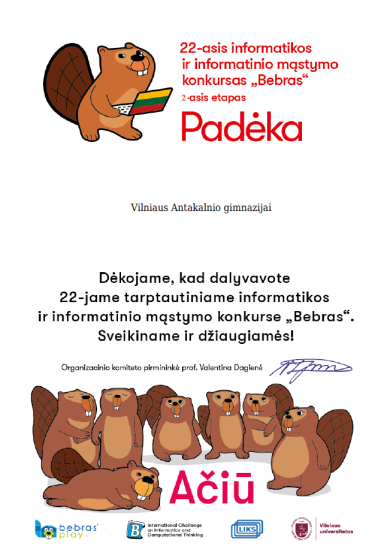 Dėkojame visiems konkurso dalyviams už aktyvų dalyvavimą, susikaupimą ir ryžtą išbandyti savo jėgas sprendžiant informatinio mąstymo užduotis.