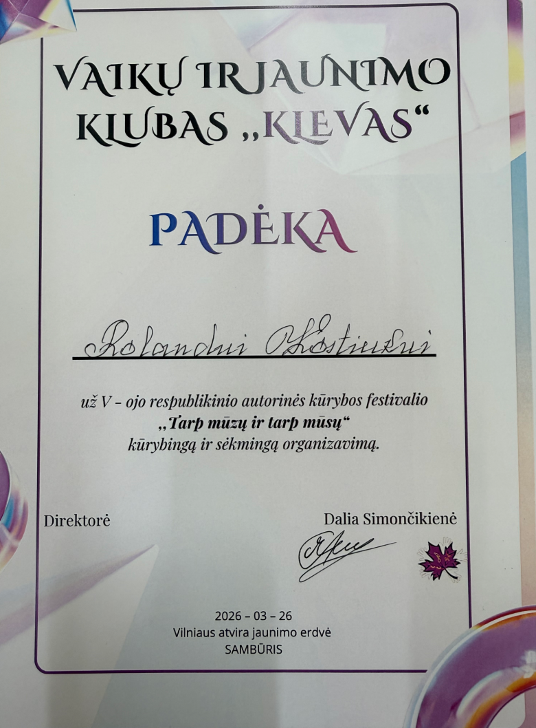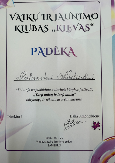 Padėka mokytojui Rolandui Kostiukui už kūrybingą ir sėkmingą festivalio organizavimą