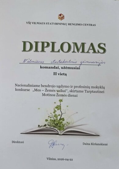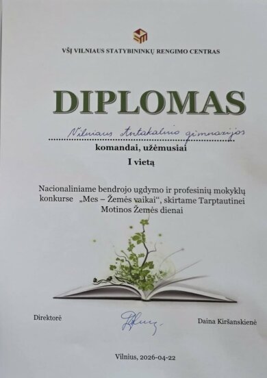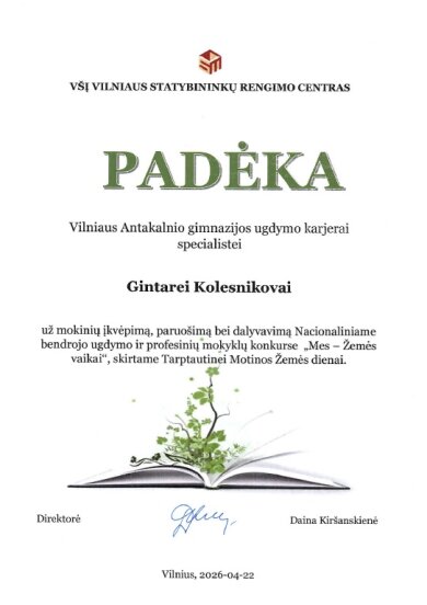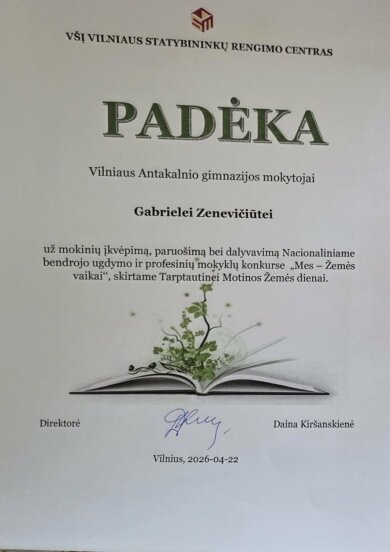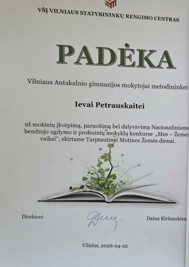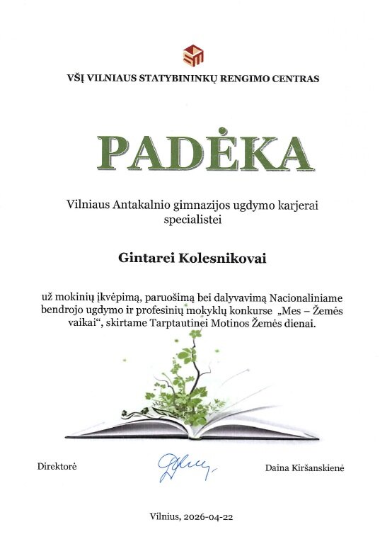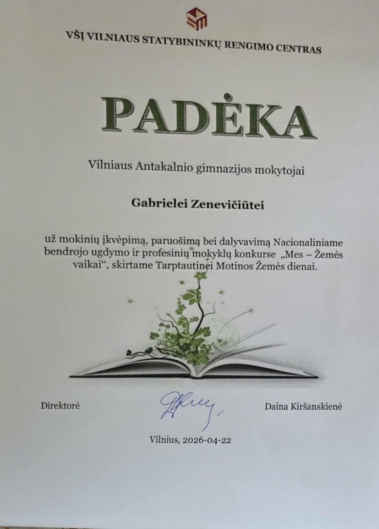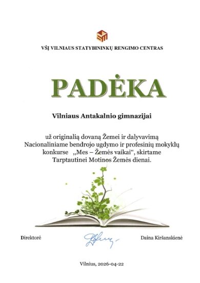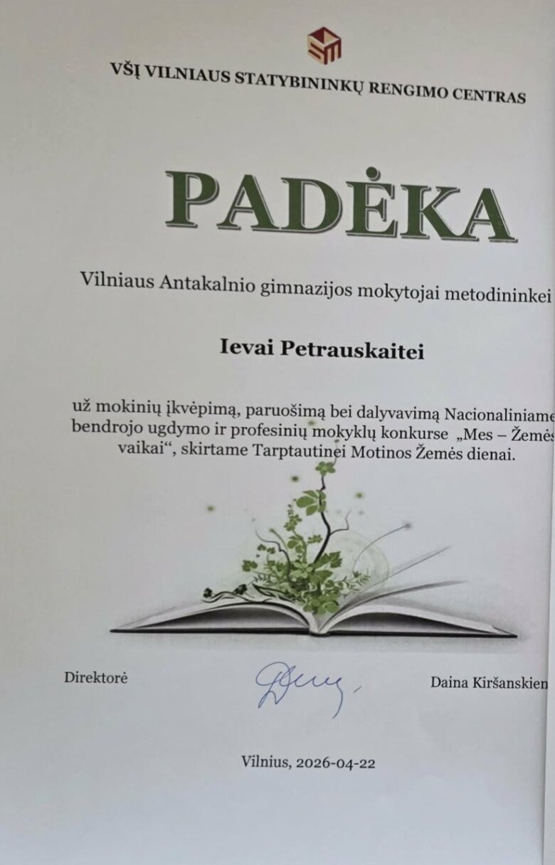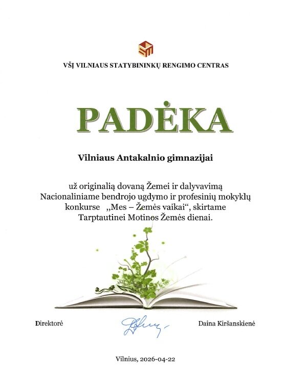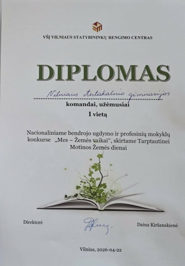 Vilniaus Antakalnio gimnazijos IIf ir IIh klasių mokiniai puikiai pasirodė nacionaliniame bendrojo ugdymo ir profesinių mokyklų 10–12 klasių (II–IV gimnazijos klasių) mokinių konkurse „Mes – Žemės vaikai“. Konkurse, lydimi ugdymo karjerai specialistės Gintarės Kolesnikovos, jie pristatė savo tiriamuosius projektinius darbus aplinkosaugos tematika.