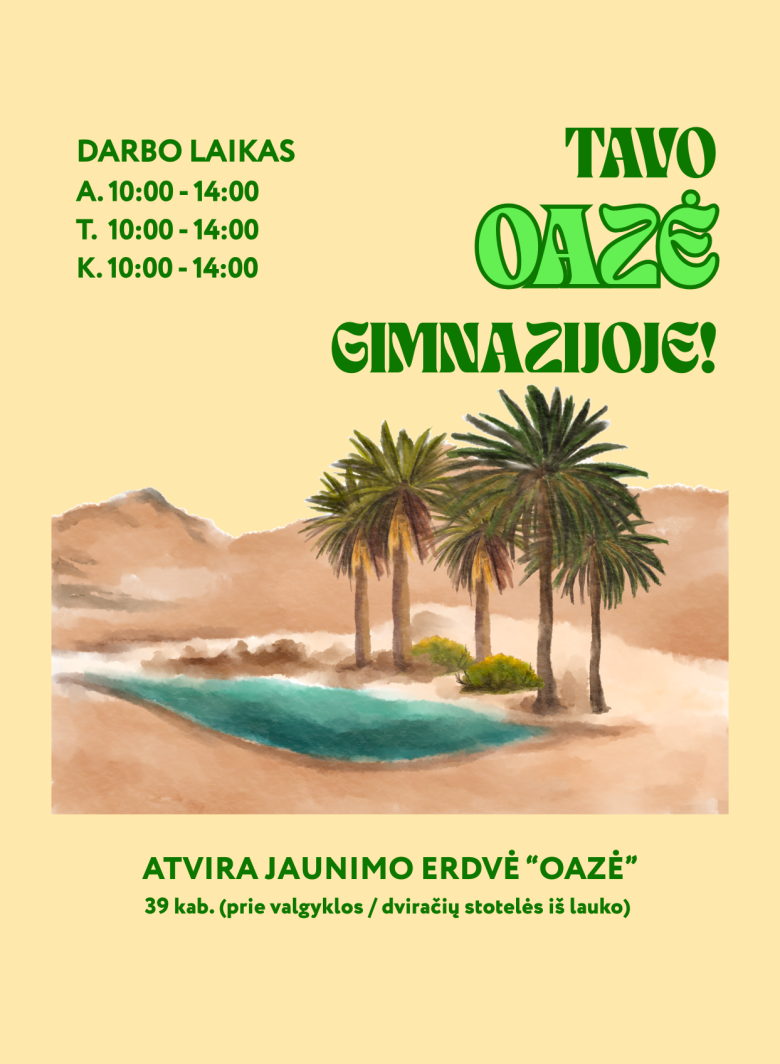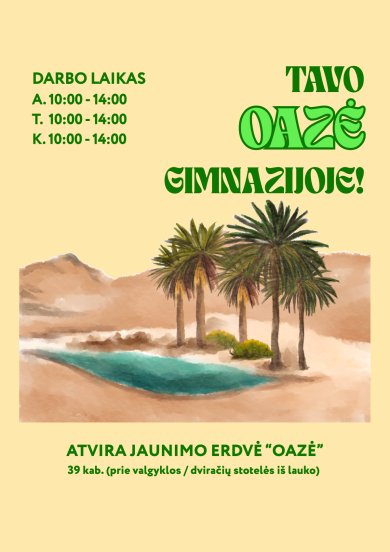 Antradieniais, trečiadieniais ir ketvirtadieniais nuo 10.00 iki 14.00 val. „Oazėje“ mokinių laukia „Žalianamio“ jaunimo darbuotojai, pasirengę išklausyti, įkvėpti kurti, atliepti poreikius ir pasiūlyti tinkamas galimybes. Po 16.00 val. erdvėje vyksta tiek „Žalianamio“ jaunimo darbuotojų organizuojamos veiklos jauniems žmonėms nuo 14 iki 29 metų, tiek gimnazijos mokinių ar mokytojų inicijuoti užsiėmimai.